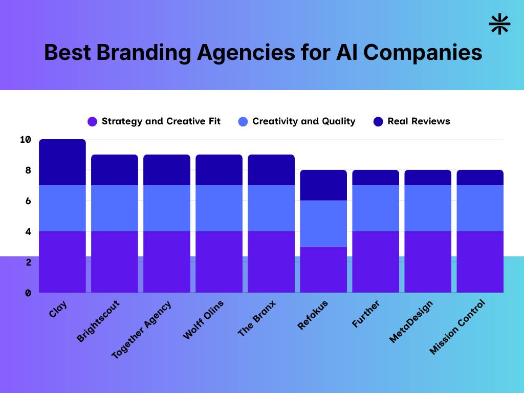 Some of the best branding agencies for AI companies include Clay, Brightscout, Together Agency, The Branx, Refokus, and Further. These agencies stand out due to their strong AI-related case studies, high-quality design execution, and ability to turn complex technology into clear, compelling brand experiences.